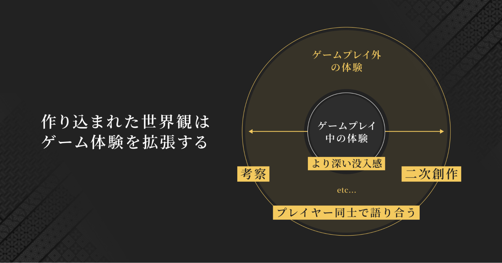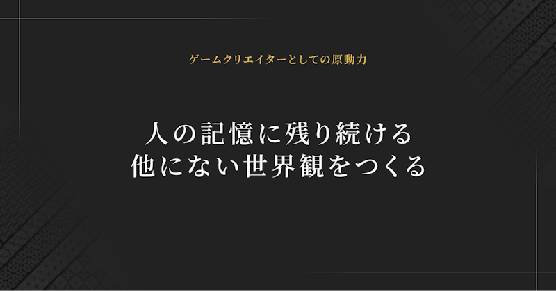 その中で、自身が最も貢献できるのは、「重厚な世界観や物語を構築すること」だと金子氏は自負しています。「ただ単にゲームシステムに後付けで装飾するのではなく、『この世界で遊びたい』『もっと深く入り込みたい』と思わせるような世界観を幹として据えること。これは、商業としてゲームづくりを成立させるうえでの私の責任でもある」と捉えています。