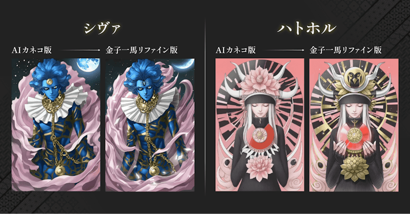 また、先行して展開されたアプリゲーム『神魔狩りのツクヨミ』の大きな特徴の一つとして、生成AIという新技術を駆使し、これまでにない新しいプレイ体験を提供する点がありました。その中核となる機能の一つが、金子氏の画風を学習したAI(AIカネコ)がオリジナルのカードイラストを生成し、リアルタイムでプレイヤー個別のカードを「創成」する仕組みです。