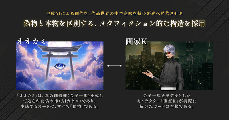 そこで本作では、作中に登場する偽の神「オオカミ」というキャラクターに扮するAIカネコが無数に生み出すカードはすべて「偽物(まがいもの)」であると定義し、金子氏自身をモデルにしたキャラクター「画家K」が描いたイラストのみを「本物」と位置づけています。