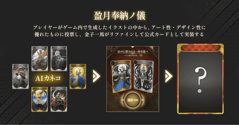 これは、プレイヤーがゲーム内で生成したカードイラストの中から、アート性・デザイン性に優れたものに投票し、金子氏自身がその中から1枚を選び、リファインして公式カードとして実装する試みです。プレイヤーと金子氏、そしてAIとの共創によって、実際のゲーム体験が拡張されていく仕組みでもあります。