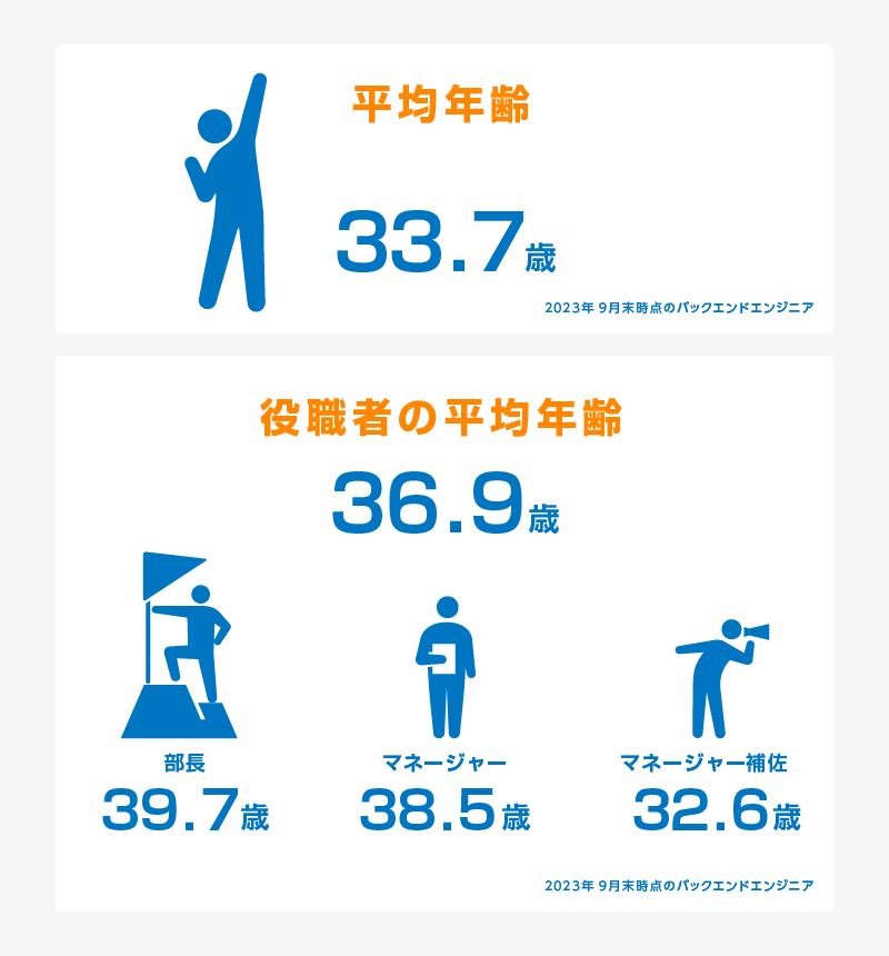 バックエンドエンジニアで働く従業員の平均年齢は「33.7」歳で、役職者の平均年齢は「36.9歳」です。