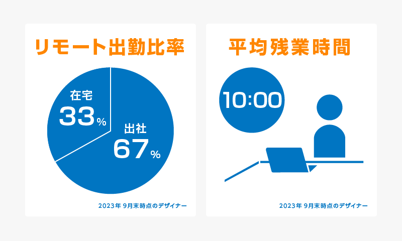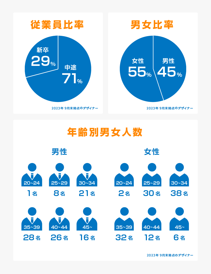 デザイナーの約3割が新卒入社、残りの約7割が中途入社の従業員です。2024年4月には、5名のデザイナーが新卒入社しました。