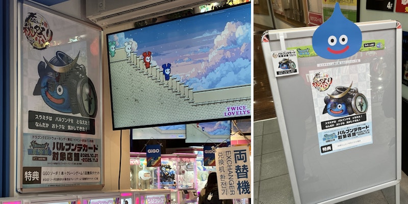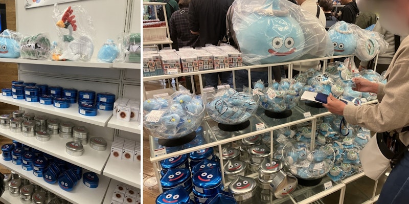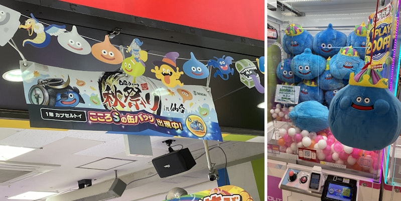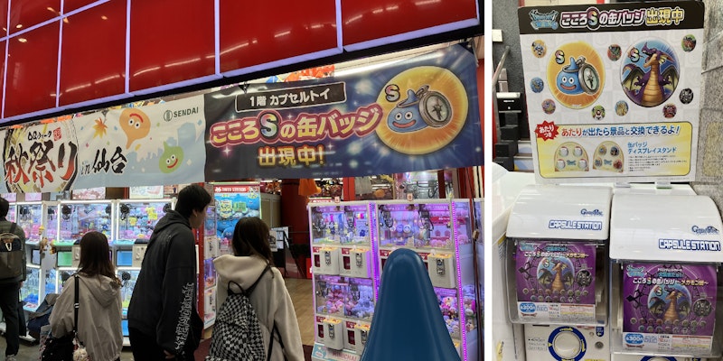 タイトーステーションの仙台クリスロード店さんも「DQウォーク秋祭り」仕様に。店頭の「こころSの缶バッジ」カプセルトイの人気がすごく、スライム帽子の店員さんが補充に追われていました。