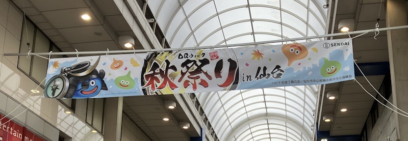 仙台駅前から西に伸びるハピナ名掛丁商店街では、正面に掛かった「DQウォーク秋祭り」の横断幕が道行く人たちの目を引いていました。
