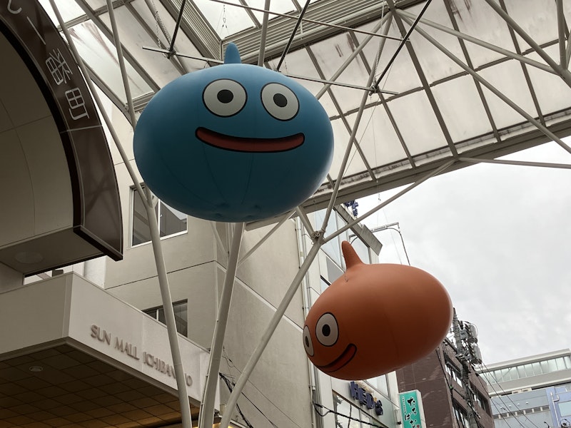 東西と南北にのびる商店街がT字型につながるポイントに、目立つ大きなスライム型バルーンが設置されていました。多くの人たちが見上げ、撮影していました。