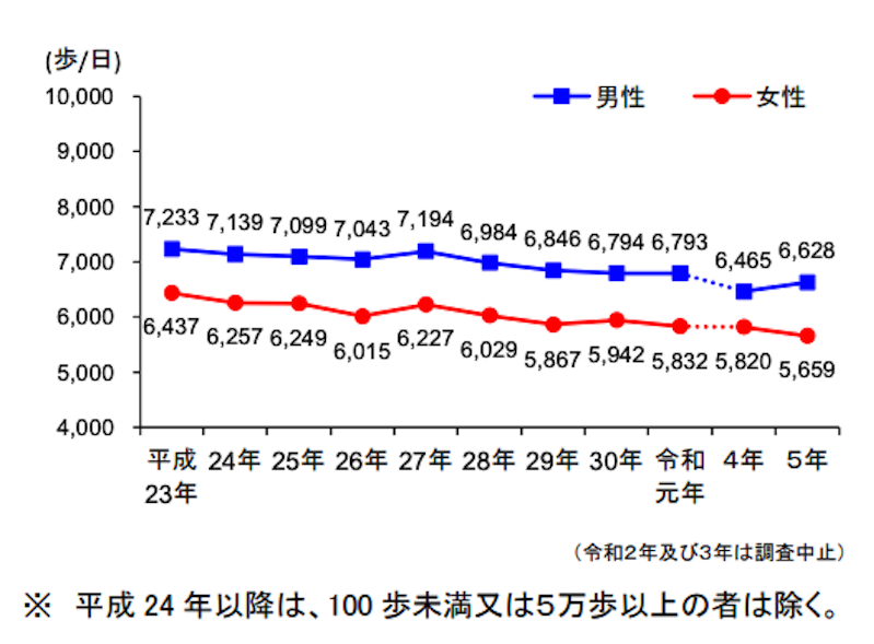 日本人の平均歩数は男性6,628歩・女性5,659歩と、この10年で減少傾向にあります。厚生労働省の目標値では、成人は1日8,000歩、高齢者は6,000歩とされており、現状とのギャップが見えてきます。
