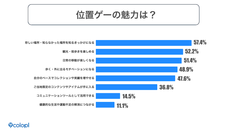 魅力として最も多かったのは『珍しい場所・知らなかった場所を知るきっかけになる』(57.4%)。続いて『観光・街歩きを楽しめる』(52.2%)、『日常の移動が楽しくなる』(51.4%)、『歩くモチベーションになる』(48.9%)が選ばれています。旅行や街歩きといった本来の目的に加えて、思わぬ楽しみが増えたり、位置ゲーが外出や移動そのもののきっかけになったりと、日常の行動を広げる存在になっていることがわかります。