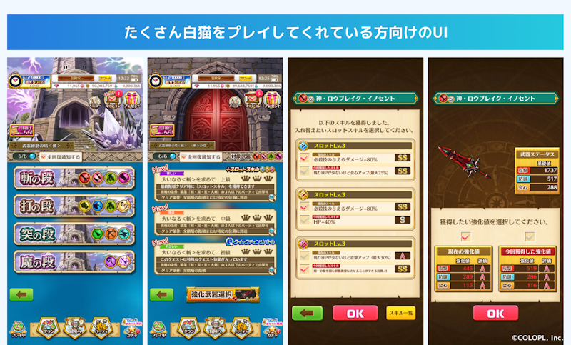 一方、まだ白猫を初めたばかりの方や、久しぶりに白猫を遊んでくれる方向けには、とにかく簡単に遊べるように、情報量は少なくタップだけでも完結するような画面を用意しました。
