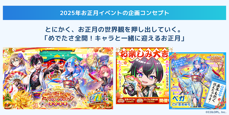 最後に、行事イベントとして開催した「2025お正月イベント」のゲーム内体験。このイベントのコンセプトは「めでたさ全開!キャラと一緒に迎えるお正月」でした。
