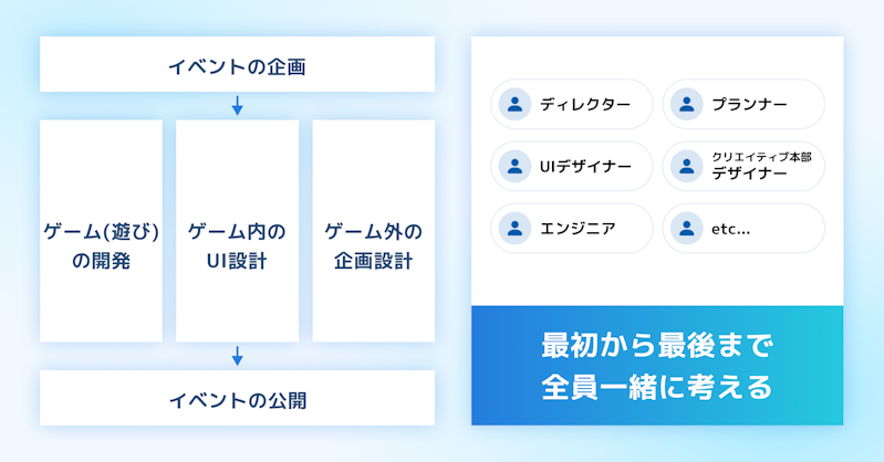 まずイベントの企画案 (コンセプトや遊び) が立ち上がり、同時並行で、ゲームの見せ方(UI)と、ゲーム外の見せ方(SNSやイベントサイトなど)を考えていきます。