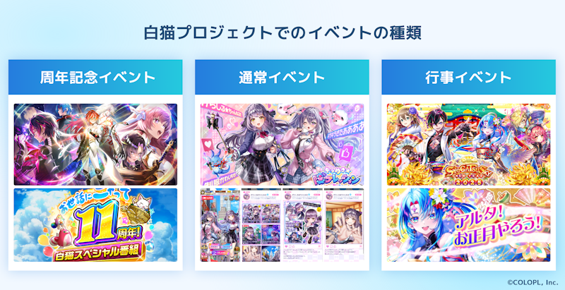 ユーザーのみなさまが飽きずにゲームを遊び続けられるよう、通常の白猫のゲーム体験に加えて、イベントという “お祭り” を定期的に開催しています。