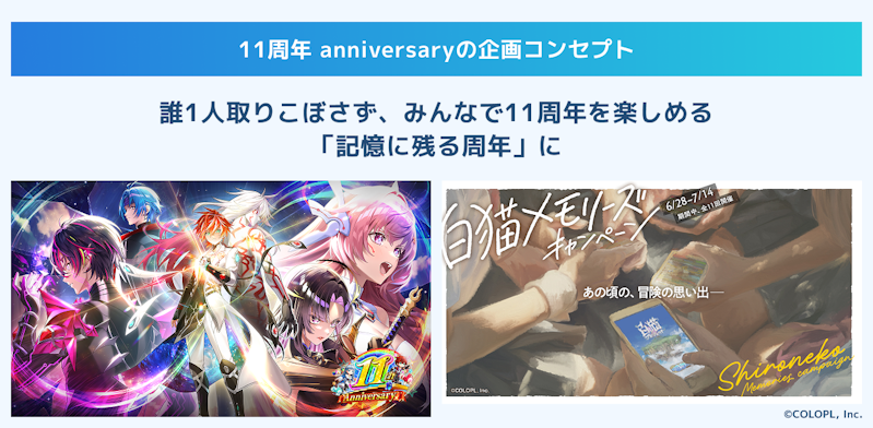 そのため、11周年という記念日をこれまでに白猫を楽しんでくれたユーザーみなさまで、誰1人取りこぼさず楽しめるように。その体験をゲーム内外からつくっていくことを目指し、「記憶に残る周年」というコンセプトで企画を考えました。