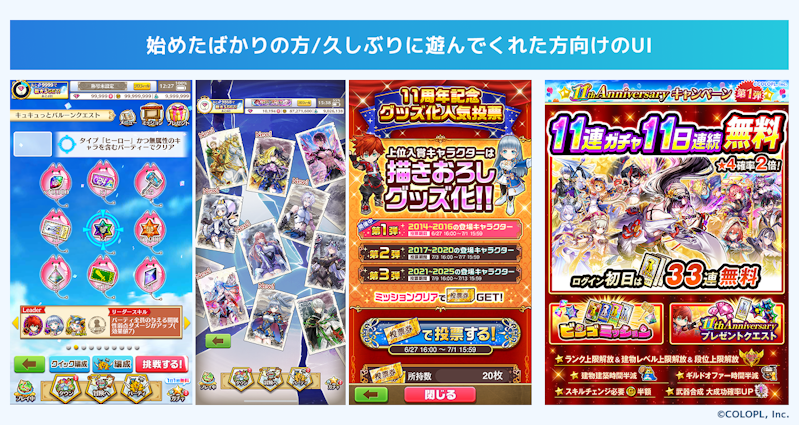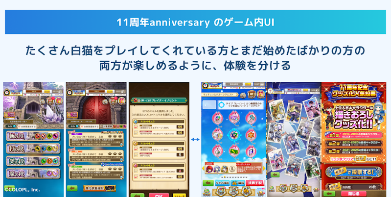 例えば、11周年 anniversaryのイベントでは、たくさん白猫をプレイしてくれている方向けにはあえて情報量も多めなゲーム画面を用意し、やりがい重視な画面設計をしています。