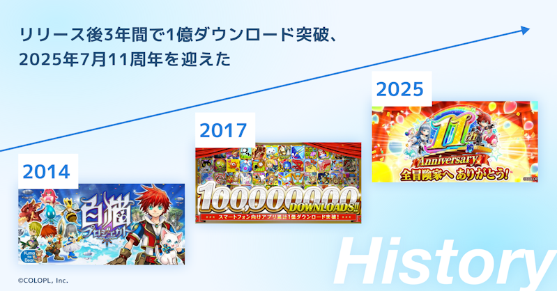 白猫という愛称でユーザーのみなさまに親しまれ、リリースから約3年で1億ダウンロードを突破。2025年には11周年を迎えました。