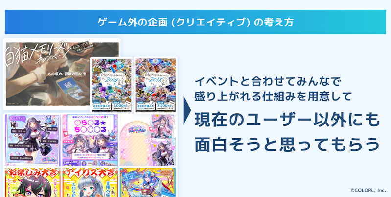 ここでは、白猫を現在プレイしていただいている方以外にも届き、イベントを面白そうだと思ってもらえるように、さまざまなクリエイティブを用意していきます。